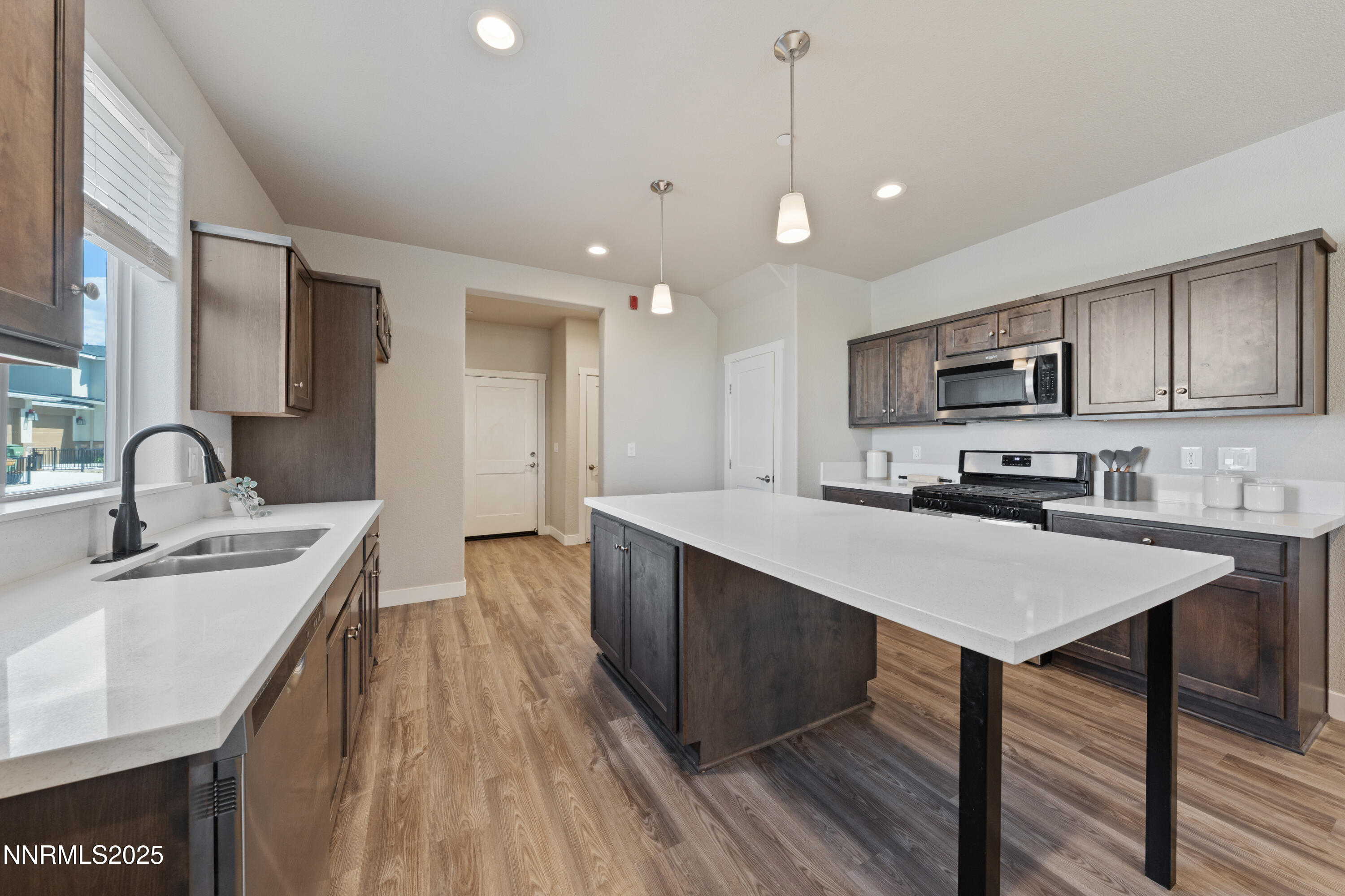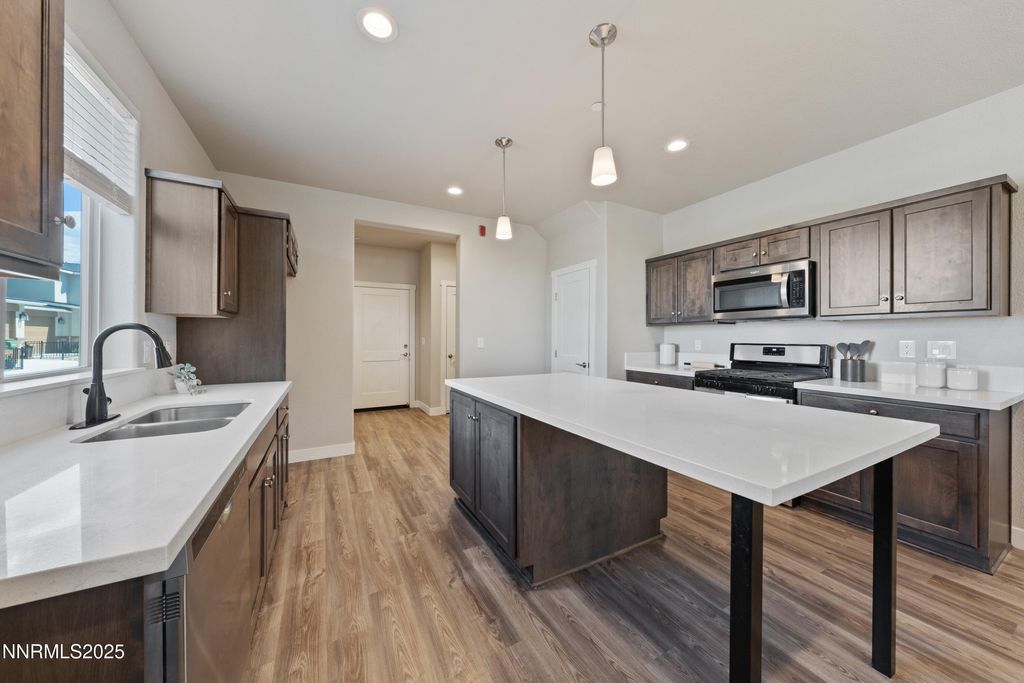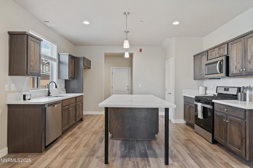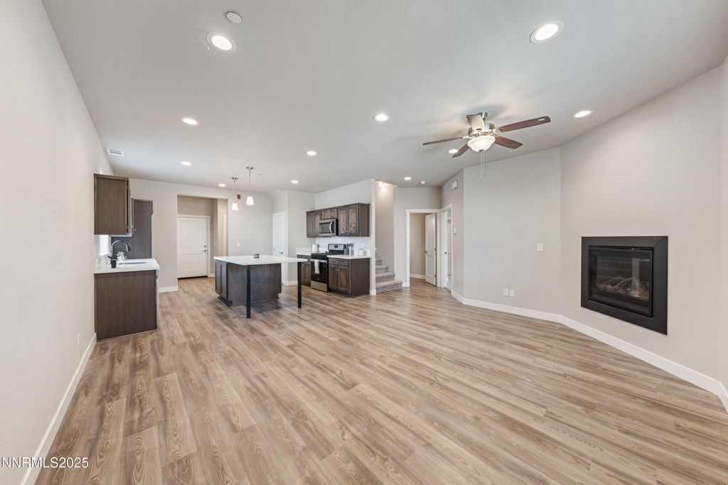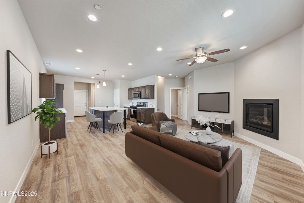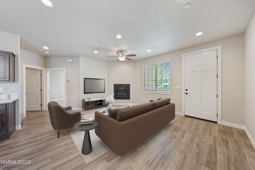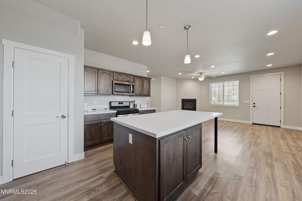 Welcome to this beautiful corner townhome in the sought-after Townhomes at Monterra community, nestled in the charming town of Minden, NV. Built in 2020, this modern home effortlessly combines comfort and style. Step inside to find elegant luxury vinyl plank flooring throughout the main living areas, with plush new carpeting in the bedrooms for added warmth and comfort. Fresh touch-up paint throughout gives the home a clean, well-maintained feel. The kitchen is truly a chef's dream, featuring a gas range stove, built-in microwave, and a spacious island that doubles as a dining table - perfect for meal prep and casual dining. Ample cabinetry and a generous pantry provide plenty of storage for all your culinary essentials. Relax in the living room by the inviting gas log fireplace, ideal for cozy evenings or entertaining guests. The primary bedroom is conveniently located on the main floor and includes a ceiling fan and a private en-suite bathroom that offers a spa-like retreat every day. Upstairs, a versatile loft awaits, perfect for a family room, home office, or game area. You'll also find three spacious bedrooms and a full bathroom, offering plenty of room for family and guests. Additional guest parking is conveniently located nearby, making hosting easy and hassle-free. This lovely townhome sits just across the street from Minden Elementary School and is only a short distance from downtown Minden, putting shopping, dining, and community amenities within easy reach. Experience the perfect blend of modern living and small-town charm in this exceptional home!