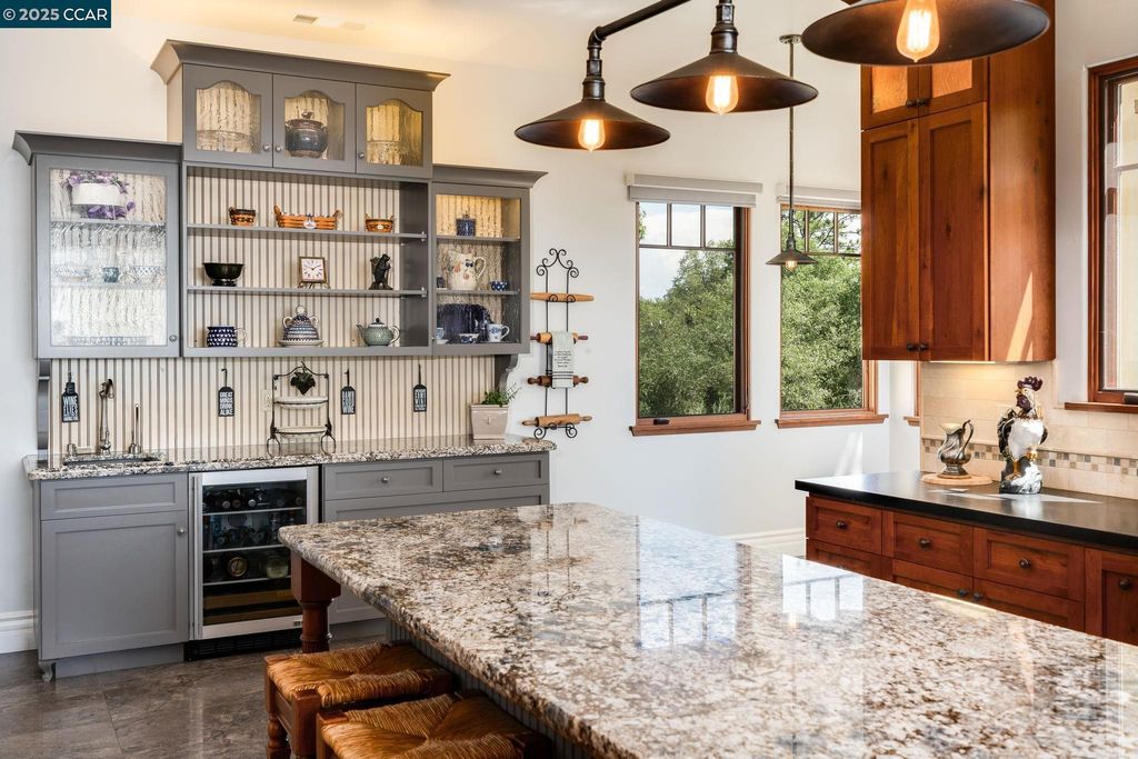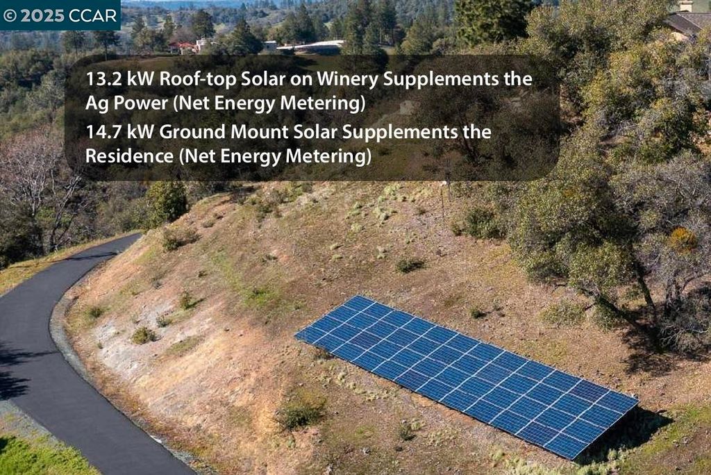 Escape to this stunning home sitting atop just under 75 acres of gorgeous land. Recreation friendly! Ample acreage for horseback riding, ATVs, hiking, or simply enjoying private, panoramic sunset and city-light views. estate is the epitome of the California contemporary luxury residence, featuring vaulted open-beam ceilings, grand formal entry, office, wine cellar, guest casita, and a second garage. Green infrastructure, including a large solar array (roof-mounted and ground-mount), underground utilities, PG&E, well water, septic, and a backup generator for reliable, off-grid capabilities. Currently operating as a winery with 5 planted acres of varietals - Barbera, Petit Sirah, Sangiovese, Vermentino, Malbec. Turn-key winery facility: a approx 2,400 sq ft insulated winery and tasting room with crush pad, refrigeration systems, and ADA parking. Outdoor event spaces framed by vineyards, a pond, rolling Sierra foothill vistas; includes paver patios, lawns, electrical/water hook-ups (food truck friendly), ideal for weddings or gatherings. Elevated location at approx. 2,100?ft above Shenandoah Valley in scenic Amador County.Guest casita (~1 bed/1 bath) configured for short-term rental or event hosting, fully furnished with mini-split HVAC and kitchenette appliances.