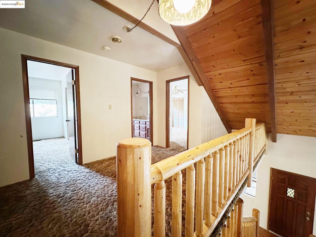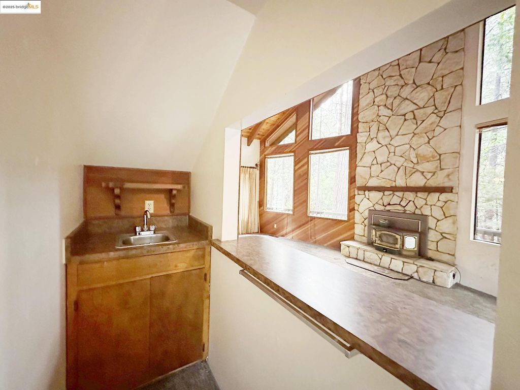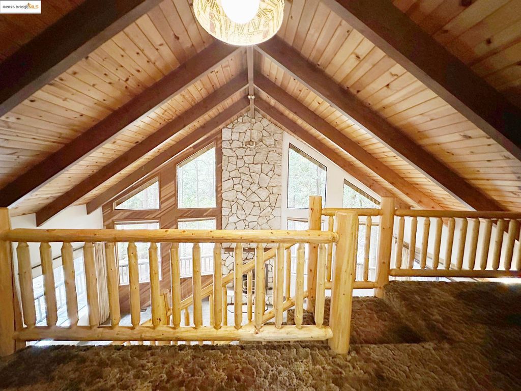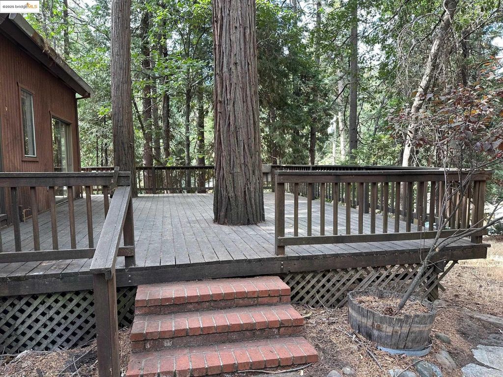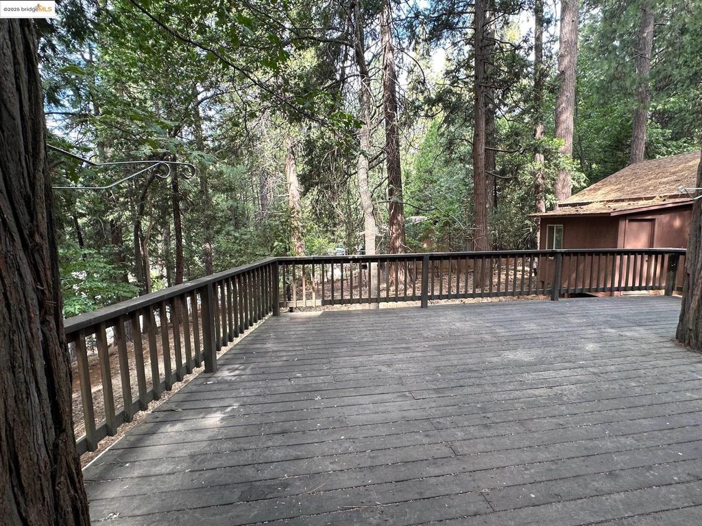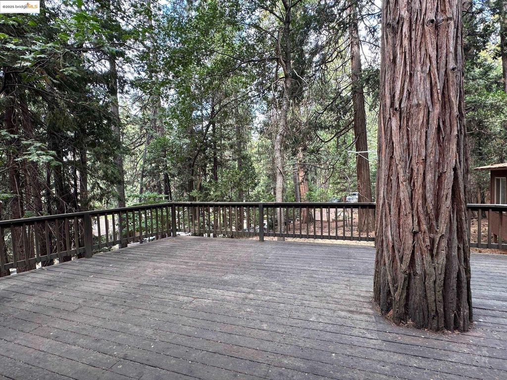 Spacious corner lot home in Cedar Ridge with a wall of windows letting in natural light. 1940 sq. ft with 3 bedrooms and 2.5 bathrooms. Primary bed/bath on entry level with 2 additional bedrooms upstairs and full bathroom. Floor to ceiling rock fireplace with wood stove insert. Rustic live edge log railing staircase up to the second floor . Mini wet bar in the living area for entertainment. Half bath is located just off of the kitchen and laundry room. Large deck on the back to relax and enjoy the shade of the trees. Detached two car garage with paved level parking with room for your RV. Bonus storage room attached to the garage. There is an annual fee for the private Cedar Ridge lake of $275.00 annually which comes with a rentable clubhouse for your gatherings. Close to Dodge Ridge, Black Oak Casino and many, many outdoor activities offered in Tuolumne County such as hiking and boating.