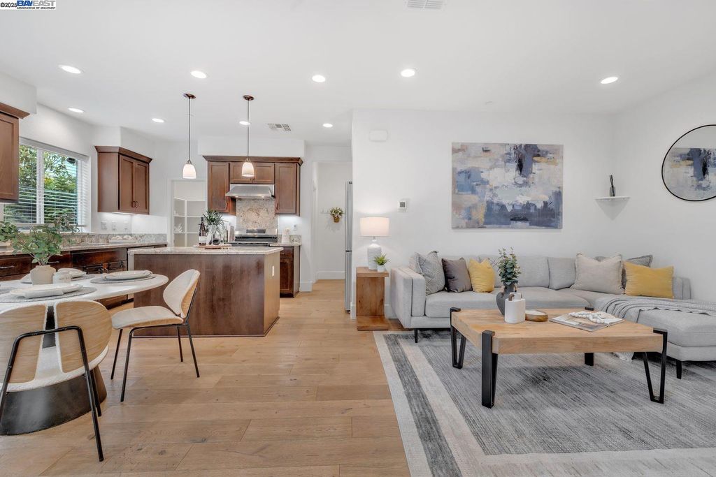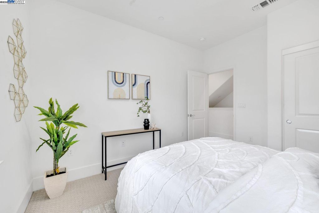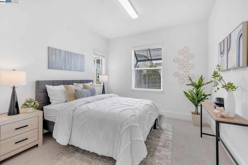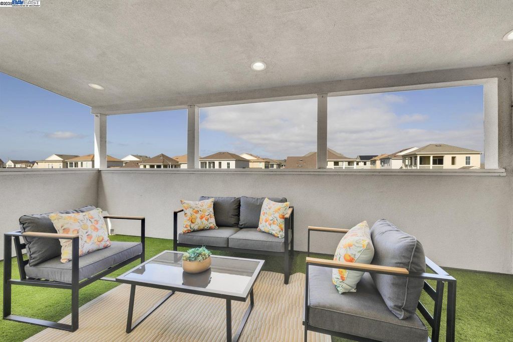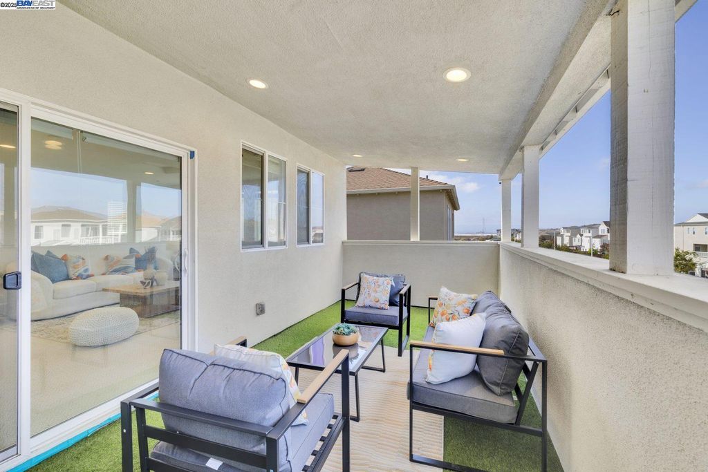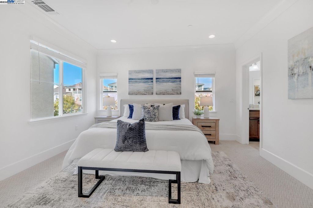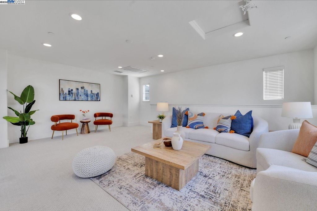 Beautiful and modern home featuring 4 bedrooms, 2.5 bathrooms, and approximately 2,041 square feet of living space. The functional floor plan includes a split 2-car garage with one driveway. Upgraded wood flooring and carpet flow throughout the home. The chef's kitchen showcases an upgraded island, granite countertops with backsplash, and premium stainless steel appliances. The spacious bonus room on the third floor offers a scenic view, covered deck, and is perfect for an office, media room, or entertaining - complete with projector and cinema hookups. The landscaped backyard includes a sprinkler system for easy maintenance. Located in the desirable Bayshores community near Facebook, Tesla, and other major employers, residents enjoy access to a private clubhouse, community park, and children's playground. Nearby Don Edwards San Francisco Bay National Wildlife Refuge provides miles of scenic trails and open space to explore. Easy access to the Dumbarton Bridge and I-880 for convenient commuting.
