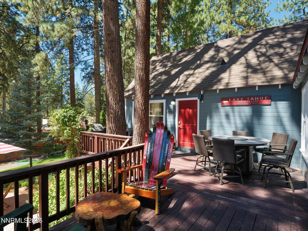 A true Tahoe treasure, once home to Muppet master Frank Oz, this classic Marla Bay retreat combines historic charm with modern comfort steps from the community's private sandy beach. Marla Bay Homeowners' Beach-ideal for swimming, sunbathing, and lakefront enjoyment. Boating enthusiasts will love the 60 seasonal boat moorings available on a first-come, first-served basis for approximately 1500 dollars per season. Inside, you'll find 5 bedrooms and 2 bathrooms, thoughtfully updated while keeping Tahoe's timeless character intact. The main level hosts the primary suite, guest bedroom, updated kitchen with stone counters and butcher block island, and a great room with a stone fireplace and pine plank floors. Upstairs, a large bunk room with a TV lounge offers the perfect place for family gatherings, sleepovers, or weekend getaways. The outdoor living is where Tahoe shines. Relax on the expansive deck or stone patio with filtered sunset views of the lake. Host BBQs in the oversized landscaped backyard, complete with a historic outdoor fireplace and horseshoe pit. With parking for oversized vehicles and an expandable daylight unfinished 400 Sqft basement for storage, this property is as functional as it is enchanting. And it's all located in the heart of Marla Bay - one of Tahoe's most historic and picturesque neighborhoods, established in 1934. Here, life slows down. Stroll to the private beach, meet neighbors along tree-lined lanes, or wander to Round Hill Pines Beach Resort for waterfront dining and boat rentals. Just 3 miles from Stateline and 6 miles from Heavenly's Boulder Lodge, you're close to the action but tucked away in a lakeside enclave where families have made memories for generations.